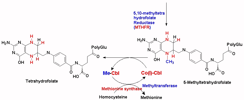 Dietary folate is predominantly 5-MTHF, and this must first be processed by methionine synthase +*CoVB12 in order for the folate to enter the folate cycle as THF. In vitamin B12 deficiency this cannot happen and so the folate and the methyl group are "trapped" as 5MTHF and virtually ineffective. Addition of folate (folic acid) as a supplement partially alleviates this as the folate cycle can proceed. One problem with this approach is that methionine is used in protein synthesis and so intracellular methionine stores become depleted. The resultant lack of SAM "turns on" MTHFR, which then pumps the 5,10-methylenetetrahydroflate into 5MTHF synthesis, which, in the absence of VB12 is once again "trapped", thereby consuming the added folate. Addition of folate to MTHFR +/+ individuals reduces the "trapping" of folate, however, residual methionine is lost by further usage in protein synthesis, thus further reducing the intracellular levels of SAM. Supplementation with excess methionine or SAM can boost methylation however it also leads to the increased production of homocysteine, with its own toxicity. It is apparent, therefore, that proper nutritional supplementation would require 5MTHF, plus methyl B12 and possibly methionine (depending upon the nutritional status of the individuals.